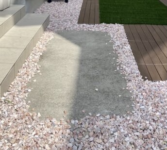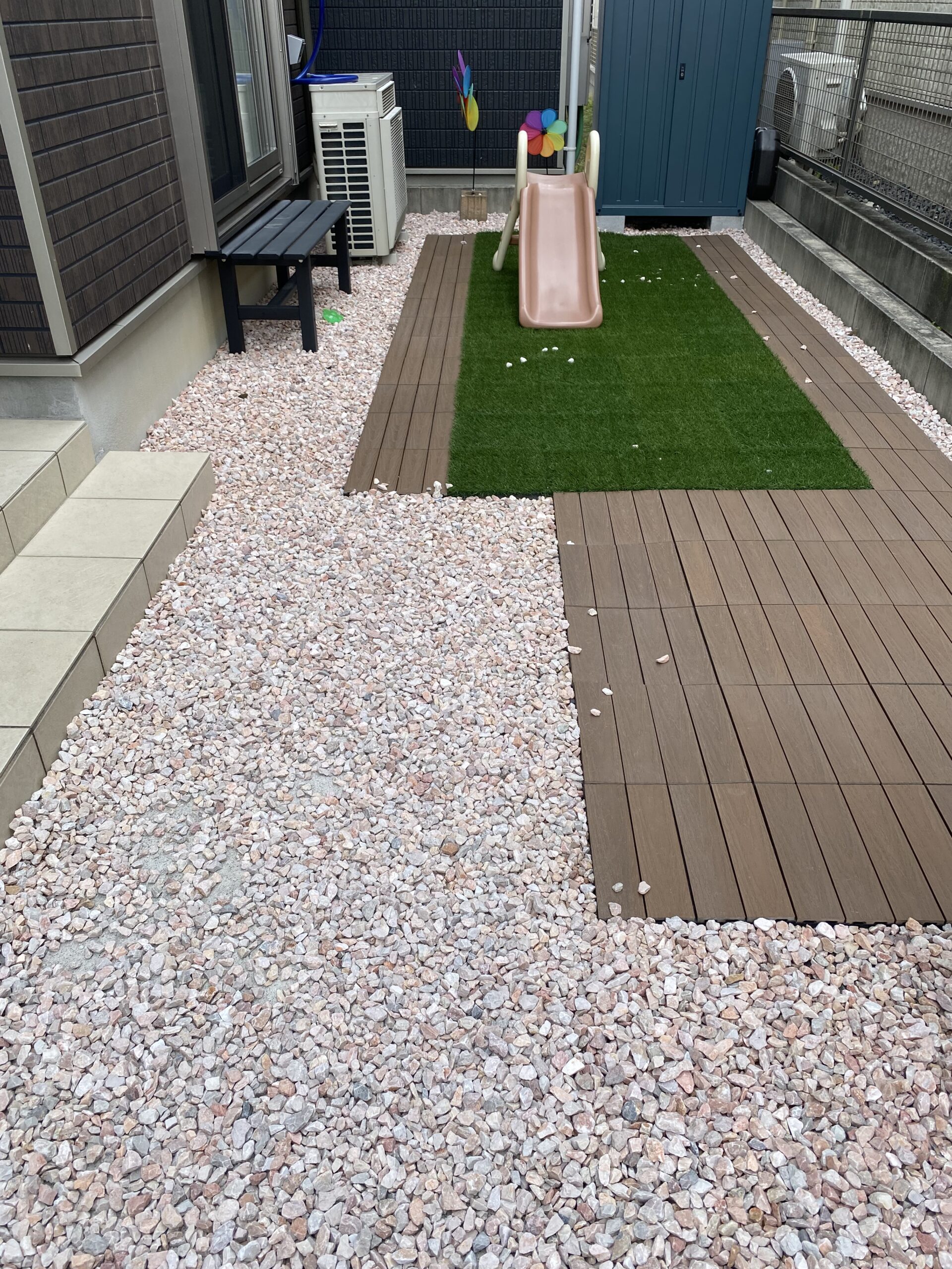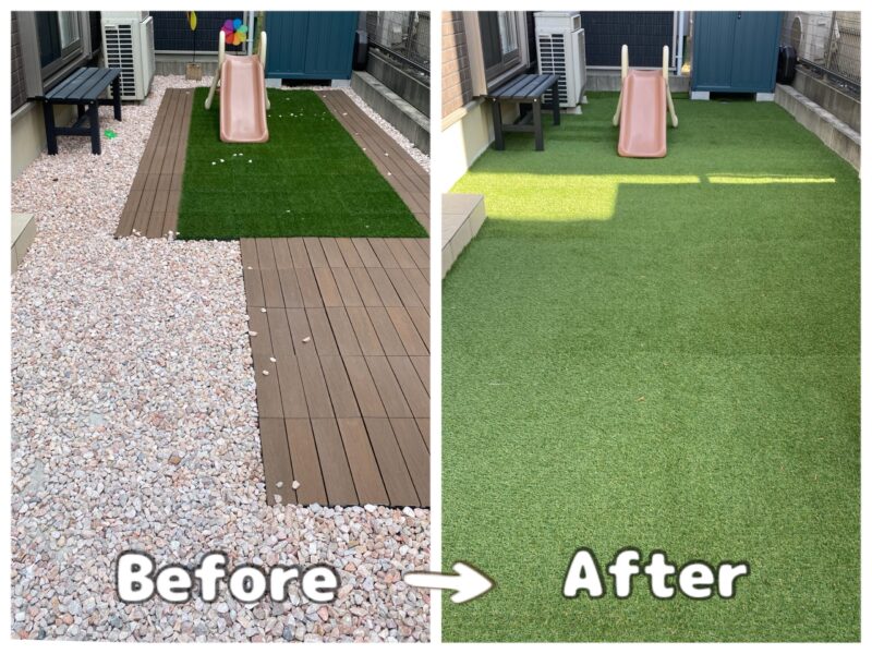 もともと使っていたジョイント芝とタイルは家の裏側に、石は横のスペースに敷き直して、無駄なくいい感じに活用できました。